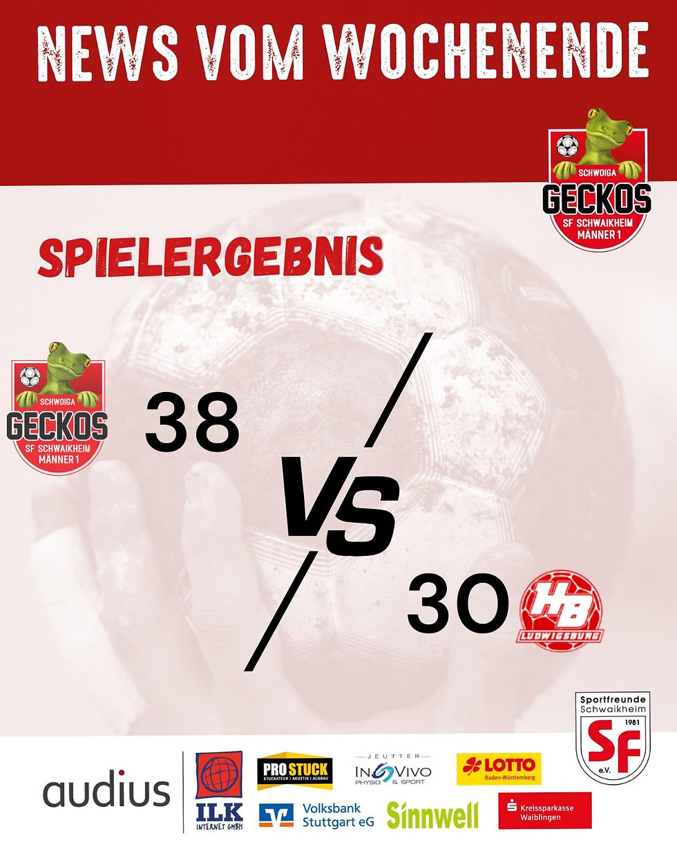 Nach einer Auszeit fanden die Gäste wieder etwas besser ins Spiel und trafen in der 39. Minute erneut (29:17). Der HB Ludwigsburg zeigte in der Folge Moral und kam zwischen der 42. und 46. Minute mit fünf Toren in Serie noch einmal auf 30:22 heran. Doch näher ließ der SF Schwaikheim den Gegner nicht kommen. Die Geckos blieben ruhig, fanden selbst wieder zu erfolgreichen Abschlüssen und hielten den Vorsprung bis zum Schlusspfiff konstant. Am Ende stand ein souveräner 38:30-Heimsieg auf der Anzeigetafel, der im Abstiegskampf enorm wichtige Punkte für den SF Schwaikheim bedeutete.